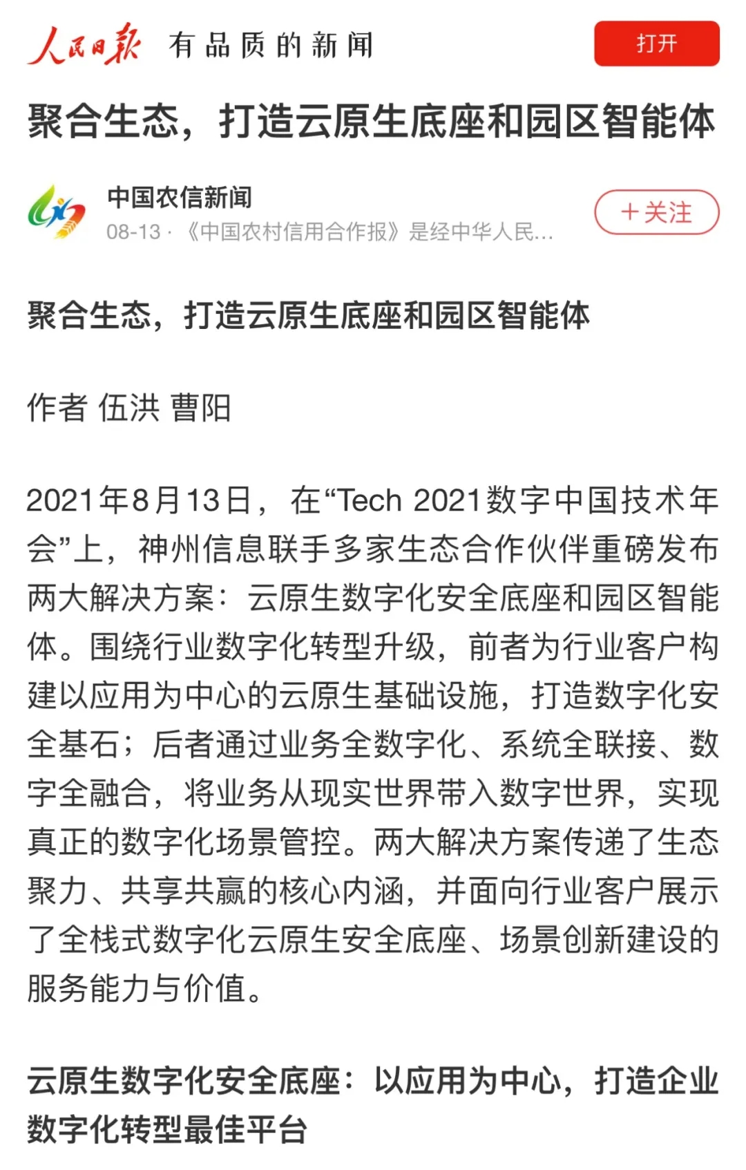 8月12日,由神州控股、BB贝博艾弗森官网、bb贝博艾弗森集团联合主办的“科技自强、数据融通、场景创新——TECH数字中国 2021技术年会”云上盛大启幕,发布神州信创云、ModelB@nk5.0、金融超脑Sm@rtFSB、云原生数字化安全底座、园区智能体等重磅产品,国内各大权威、影响力媒体多角度多频次对盛况进行报道!