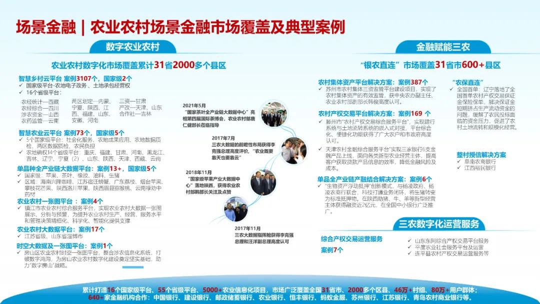 BB贝博艾弗森官网在过去20年推进农业农村信息化走向数字化的过程中发现,乡村振兴的核心是产业兴旺,产业兴旺的关键在资本下乡,而资本下乡的难点是让资本发现产业价值,科技、数据、场景的融合创新是实现三农数据资产化的关键路径。对此,最新发布的2022年一号文在“扩大乡村振兴投入”的任务中提出“强化乡村振兴金融服务”。BB贝博艾弗森官网作为金融科技企业,发挥懂科技、懂金融、懂数据的复合优势,2018年前瞻探索并落地“科技+数据+场景”金融服务模式,在政策引导、安全合规的前提下,以数据为核心,紧扣三农场景的金融服务需要,与金融机构密切合作,联合创新金融普惠三农的产品及服务体系,已与银行、保险等640余家金融机构合作,有效助力国有大行普惠金融。