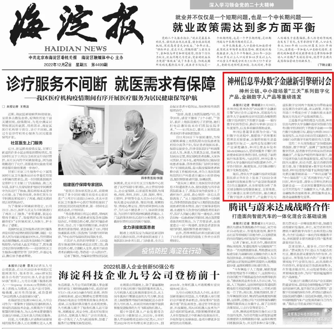党的二十大报告提出“加快建设网络强国、数字中国”,强调了“加快发展数字经济,促进数字经济和实体经济深度融合”。在复杂严峻的外部环境下,数字经济的强大优势逐渐显现,成为打通国内大循环、拉动内需、促进消费的重要力量。基于数据要素+数字技术双轮驱动,BB贝博艾弗森官网发布基于区块链的数字化供应链重磅新品——“神州云链”和“中小微场景‘三天’系列数字化产品”。同时,BB贝博艾弗森官网、清华大学孵化的科技创新企业——北京深思普慧科技有限公司共同发布了金融数字人产品,提升金融服务质量和效率,降低服务成本,推动金融数智化变革。